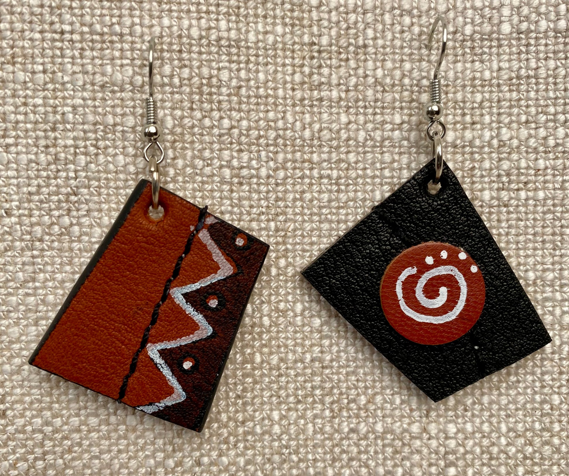 ART TO EAR. Each pair is one-of-a-kind. The various decorative methods include; stamping, sewing, collaging, hand painting, embossing, and texturing. All earrings are painted on the back and edges for a beautiful finish. Earring hooks are hypoallergenic.