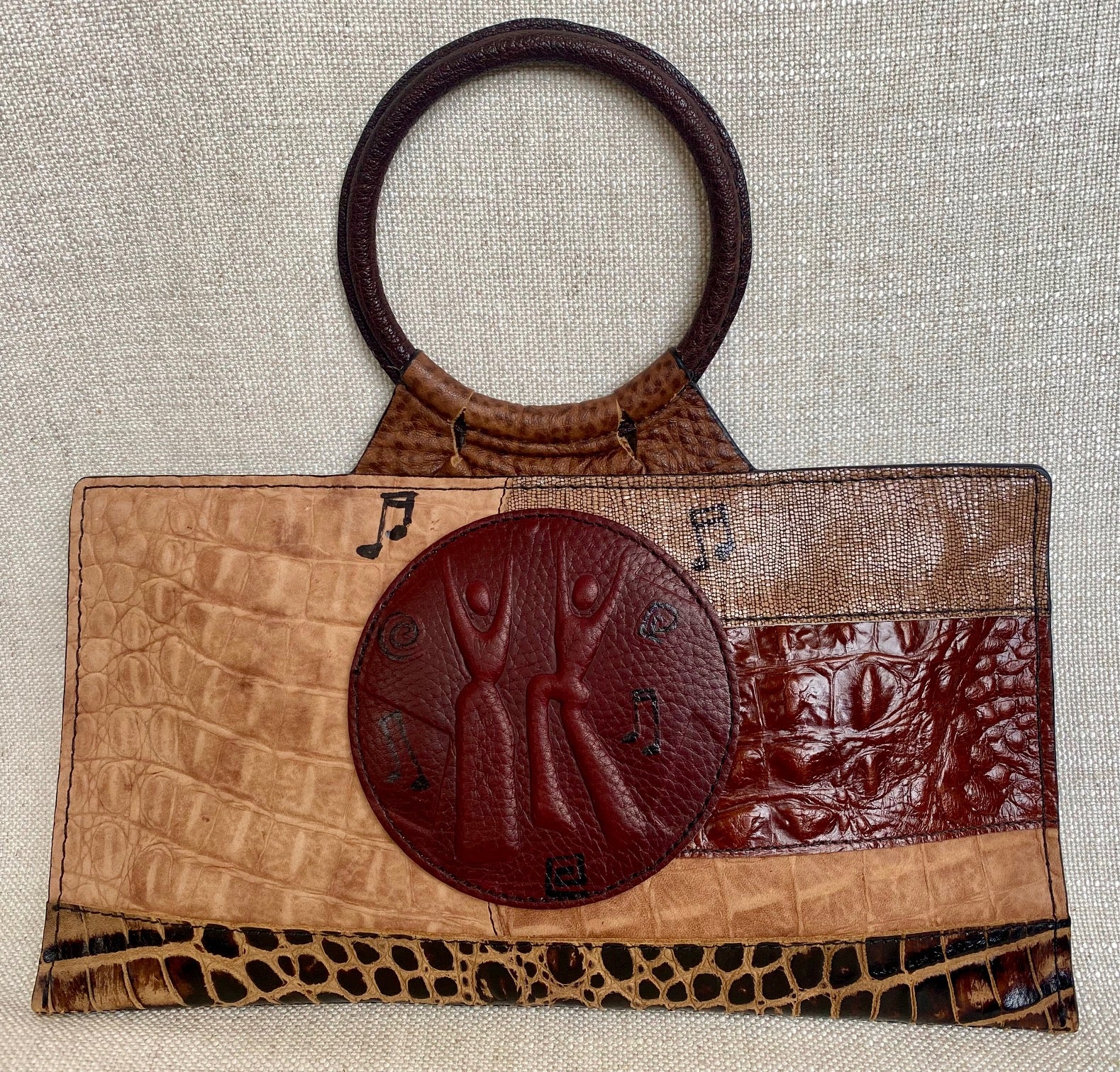 RING HANDLE BAG: This leather bag is meticulously handcrafted and features a fully lined interior, secure back zipper closure with an exterior cell phone pocket and an interior pocket. This bag also showcases a metal handle wrapped in leather. It measures 12-1/2 inches wide by 6-1/2 inches high. The Ring Handle Bag serves both a practical purpose and makes a bold statement wherever you go—it's truly art to wear!