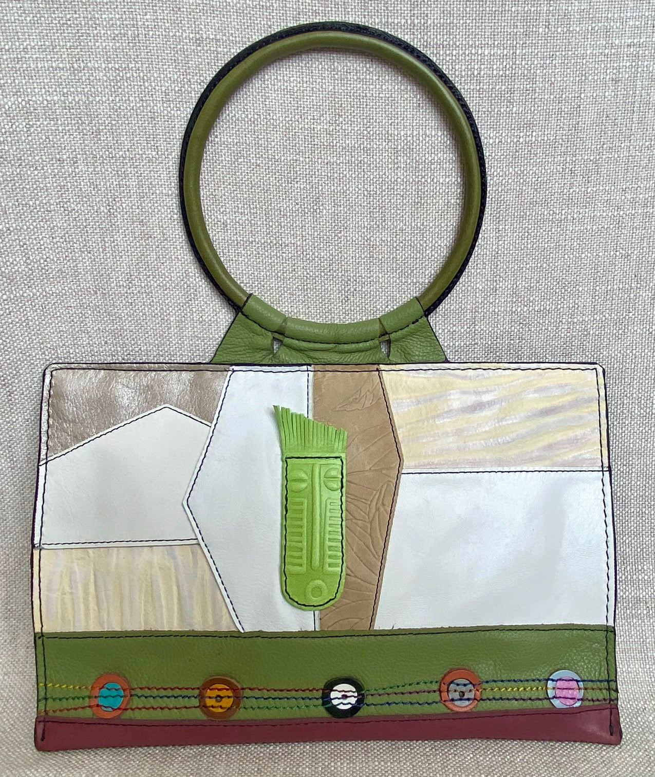 RING HANDLE BAG: This leather bag is meticulously handcrafted and features a fully lined interior, secure back zipper closure with an exterior cell phone pocket and an interior pocket. This bag also showcases a metal handle wrapped in leather. It measures. 11 inches wide by 7 inches high. The Ring Handle Bag serves both a practical purpose and makes a bold statement wherever you go—it's truly art to wear!